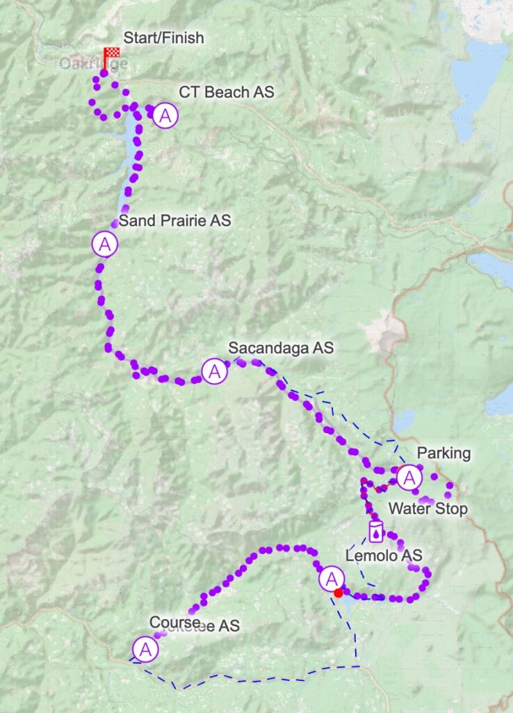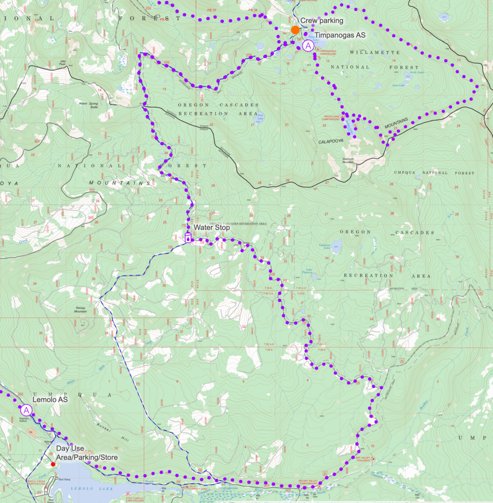 From the Water Only aid, go left onto 700 (crew will go right). Continue on Road 700 until it T’s into Road 60. Go right. After you pass the Kelsay Valley Campground entrance, you’ll get onto the North Umpqua Trail (NUT) and make your way along the north side of Lemolo Lake. You’ll pass through a burned area, from a 2024 fire. The aid station is beside the canal at the White Mule (aka Lemolo Falls) trailhead.
